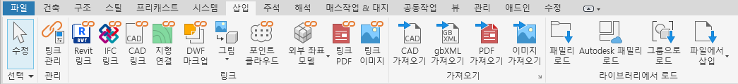 리본은 파일을 작성하거나 열면 표시되고, 프로젝트나 패밀리 작성에 필요한 모든 도구를 제공합니다.