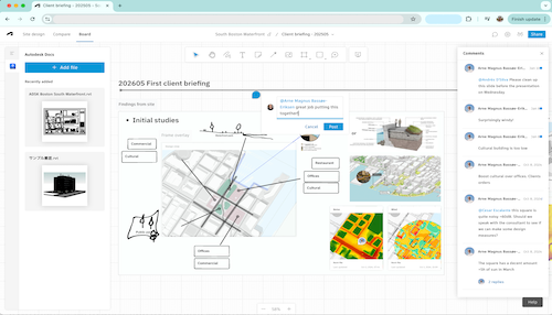 설계 스토리와 프로세스를 전달하도록 설계된 Forma 보드는 Forma 설계 및 해석 도구의 유연한 보조 역할을 합니다. 이를 통해 아이디어와 설계 스토리를 한데 모으고, 시각화하고, 공유할 수 있습니다. Forma <--> Autodesk Docs 연결을 통해 Docs에 저장된 다른 Autodesk 솔루션의 설계 및 모델을 시각화하고 설계 설명에 통합할 수 있습니다.