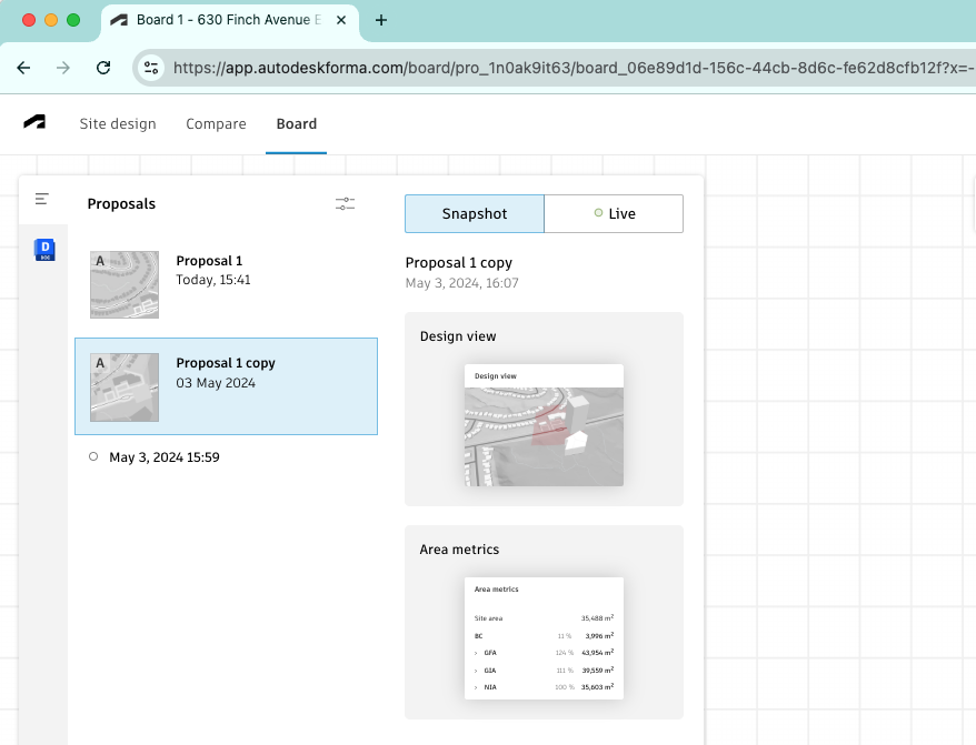 - Forma Site Design에서 작성된 Revit 제안서, 시트 및 해석을 비롯한 파일을 Docs에서 검색하고 고정할 수 있습니다. 정적 및 라이브 상태 모두에 해석을 추가할 수 있습니다. 정적 분석은 변경되지 않은 상태로 유지되는 반면 라이브 분석은 실시간으로 업데이트됩니다.