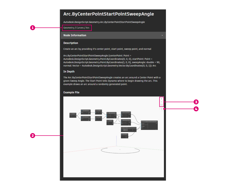 Dynamo 문서 탐색기를 사용하여 특정 노드에 대해 자세히 알아보고 샘플 그래프를 작업공간에 삽입할 수 있습니다.