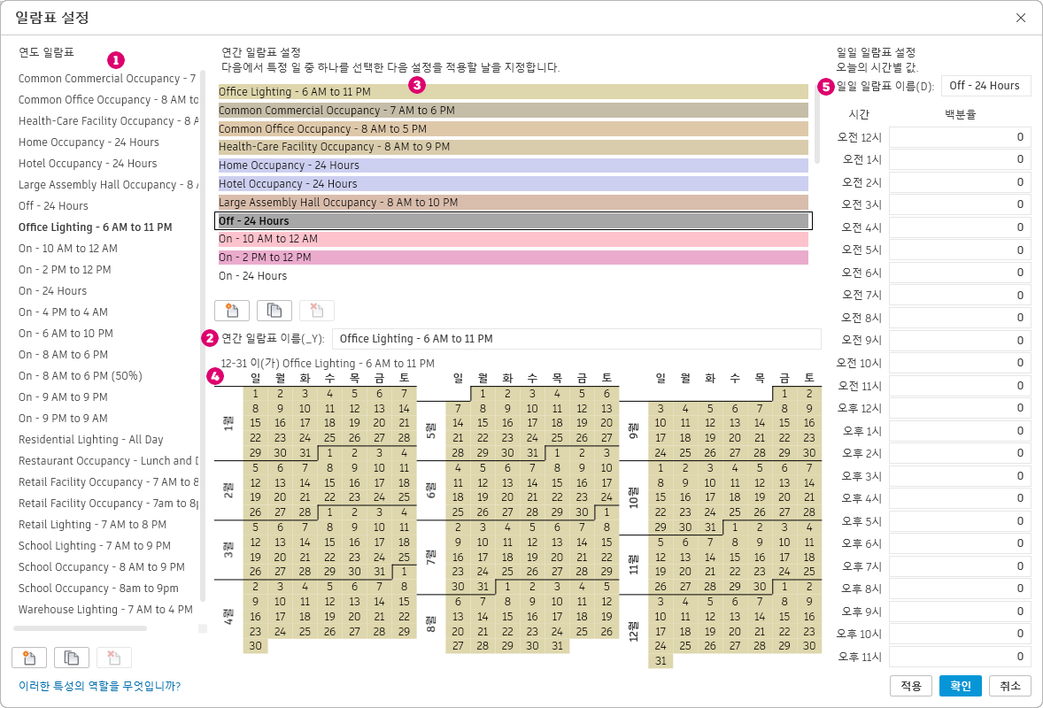 - 건물/공간 유형 설정 대화상자에서 일람표(점유, 조명 및 전력 일람표)에 대한 값 필드를 클릭한 후