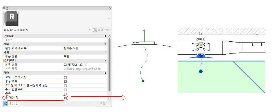 경우에 따라 커넥터가 공간 내부에 위치하지 않도록 조명 설비를 배치할 수 있습니다. 룸 계산 점을 검색 점으로 사용하여 조명 설비를 둘 공간을 결정합니다. 조명 설비에 대한