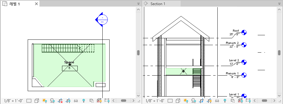 팁: 입면도를 작성하여 레벨을 작성할 수 있지만 공간은 입면도에 표시되지 않습니다.