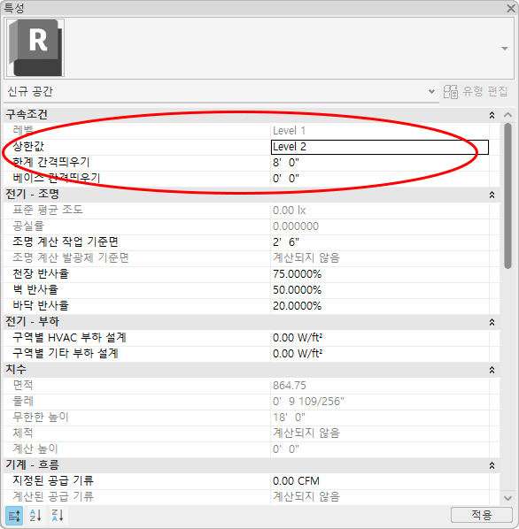 공간의 수직 범위가 재정의되고 공간의 체적이 사용자 지정을 따릅니다.