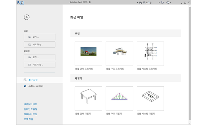 Revit 홈에는 컨텐츠 링크, 새로 고침 버튼, Autodesk Docs 액세스 등 최적화된 정보 아키텍처를 제공하는 Autodesk 표준에 맞게 최신 비주얼 스타일도 표시됩니다.