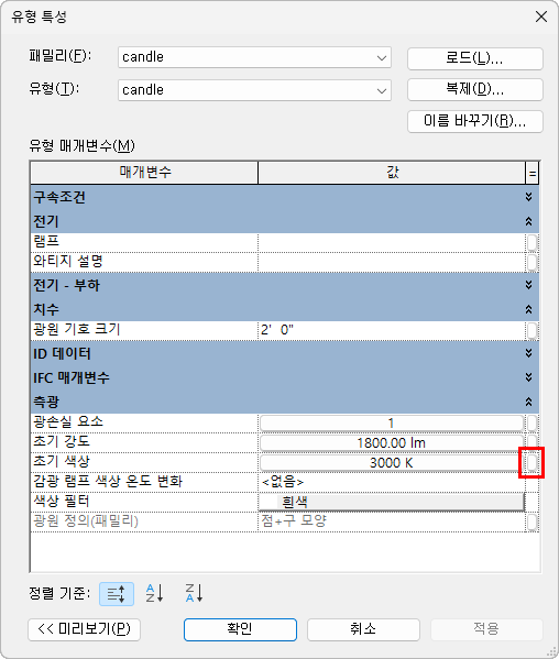 2. 패밀리 카테고리 및 매개변수 대화상자의 패밀리 매개변수에서 광원을 선택합니다.
