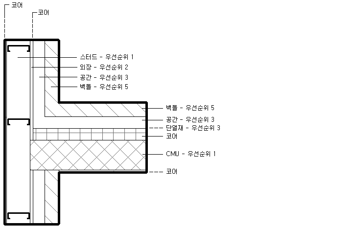 다음 그림에서는 더 높은 우선순위 레이어가 더 낮음 우선순위 레이어보다 먼저 결합되는 것을 보여줍니다. 수평 벽의 우선순위 1 CMU 레이어는 수직 벽의 우선순위 1 스터드 레이어에 도달할 때까지 모든 레이어를 통과합니다. 수평 벽의 단열재는 수직 벽의 공간을 통과하지 않습니다. 이는 둘 다 우선순위 3이고 코어 레이어 외부에 있기 때문입니다.