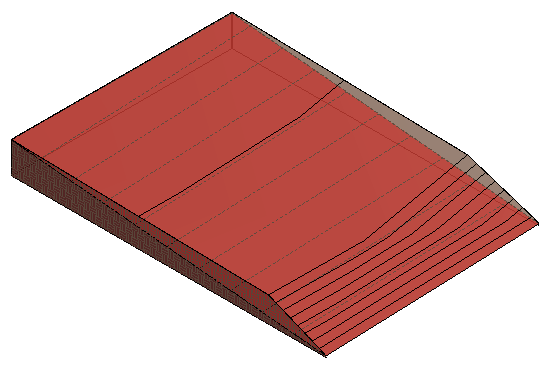 레벨링 영역을 작성하기 위해 현재 공정에 있는 기존 표면인 지형 솔리드를 선택합니다. Revit LT은 원래 표면을 철거된 것으로 표시하고 경계가 일치하는 사본을 작성합니다. Revit LT은 해당 사본을 현재 상에서 새 상으로 표시합니다.