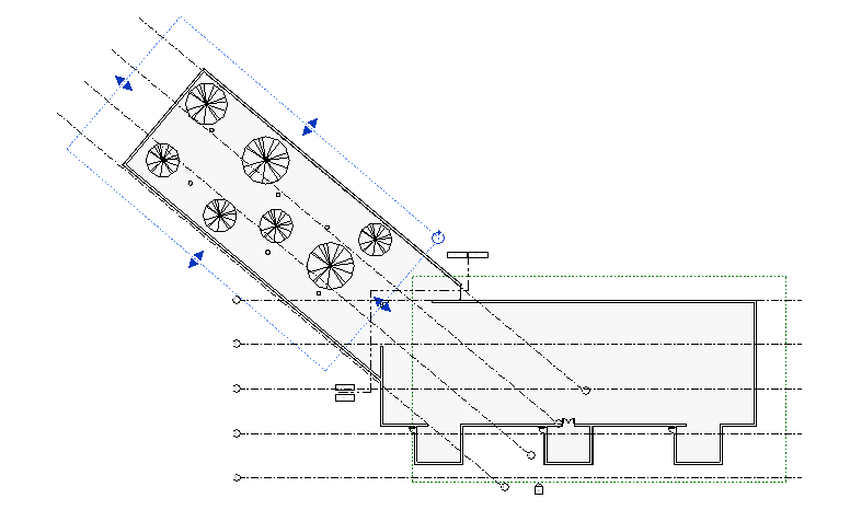 다음 평면에는 2개의 스코프 박스가 있습니다. 하나는 주 건물 주위에 있고 다른 하나는 별관 주위에 있습니다. 스코프 박스를 그리면 스코프 박스의 크기를 조정하는 데 사용할 수 있는 끌기 컨트롤이 표시됩니다. 또한 회전 컨트롤
