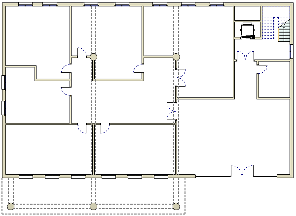 예를 들어 레벨 1 평면 뷰에서 레벨 2를 언더레이로 지정할 수 있습니다. 레벨 2에 지붕이 있는 경우에는 평면 뷰에서 지붕을 선택한 후 수정할 수 있습니다. 뷰와 동일한 레벨을 언더레이로 사용하여 천장이나 보 또는 뷰에 표시되지 않은 다른 요소를 선택할 수도 있습니다. 언더레이를 추적하기 위한 오버헤드 선 스타일을 사용하거나 자신만의 선 스타일을 정의할 수 있습니다.