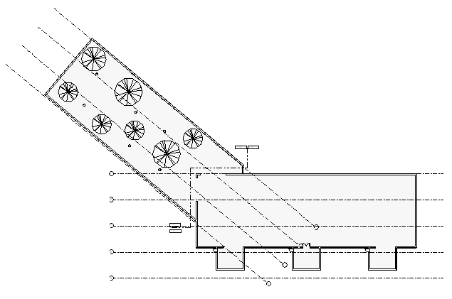 예를 들어 다음 평면에는 주 건물에 비스듬히 별관이 있는 연구 센터가 있습니다. 주 건물과 별관은 서로 다른 그리드를 사용합니다. 매치 라인은 이 평면이 건물의 각 부분을 별도의 시트에 표시하기 위한 의존적 뷰로 나뉘는 위치를 나타냅니다. 그러나 별관의 의존적 뷰에서는 주 건물의 그리드 선을 표시하지 않고, 주 건물의 의존적 뷰에서는 별관의 그리드 선을 표시하지 않을 수 있습니다. 스코프 박스를 사용하여 이 작업을 수행할 수 있습니다.