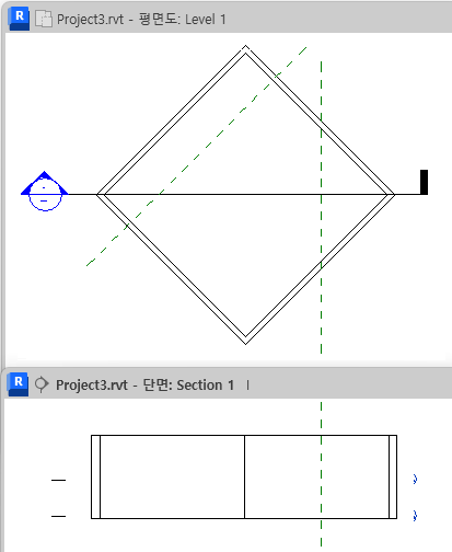 예를 들어 다음 평면에는 2개의 참조 평면이 초록 파선으로 표시되어 있습니다. 왼쪽에 있는 참조 평면은 단면 선과 비스듬하게 교차합니다. 오른쪽에 있는 참조 평면은 단면 선과 수직을 이룹니다. 기울어진 참조 평면은 구획 선과 수직을 이루지 않기 때문에 결과 구획도에 나타나지 않습니다. 그러나 수직 참조 평면은 구획도에 표시됩니다.