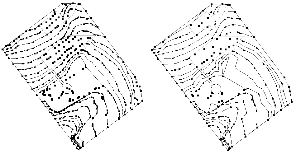 지형의 각 점은 삼각형 형상을 작성하고 이는 계산 오버헤드에 추가됩니다. 요소가 수많은 점을 사용하여 작성된 경우 이를 단순화하여 시스템 성능을 개선할 수 있습니다. 요소를 단순화하면 지형의 특정 조건에 따라 등고선의 정확도와 형상이 영향을 받을 수 있습니다. 요소를 단순화한 후에는 등고선 및 형상을 확인하십시오. 필요한 경우 정확도를 높이기 위해 점을 추가합니다.