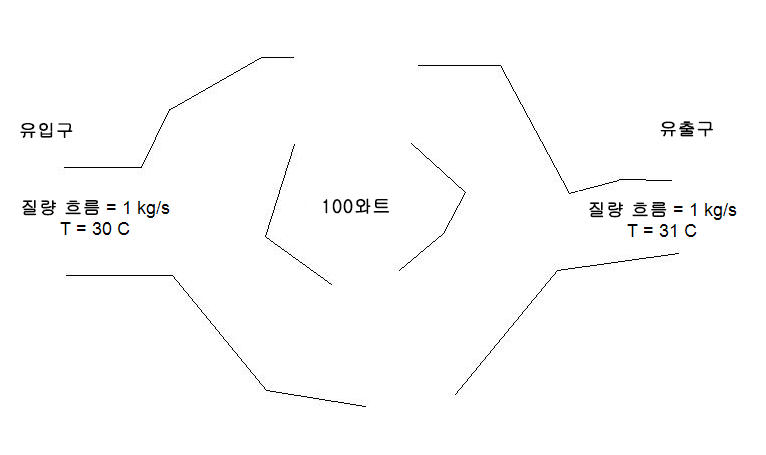 예를 들어 아래 그림의 열 전달 문제에서 입구에서 출구까지의 예상 온도 상승은 질량 흐름 1kg/s에 1°C이며 에너지 입력은 100와트입니다(유체의 비열이 100).