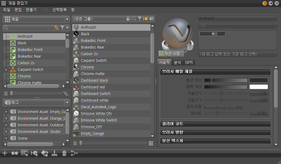 새로운 서비스 및 클래스에 대한 자세한 내용은 Python 설명서(도움말 > Python 문서 > VRED Python API v2 설명서)를 참조하십시오. 이제 새 재질 편집기에서 여러 재질을 동시에 선택하고 전체 선택에 대한 값을 한 번에 변경할 수 있습니다. 예를 들면 선택한 모든 재질의 분산 색상을 동시에 변경하거나 여러 재질에 대한 재지정을 설정할 수 있습니다.