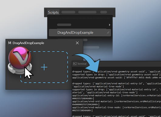 또한 플러그인을 개발하는 사용자를 위해 이제 장면 그래프 또는 기타 분리된 모듈에서 드래그 앤 드롭 기능을 사용할 수 있는 MIME 데이터도 지원됩니다. VRED UI에서 노드를 드래그 앤 드롭하고 터미널에서 결과를 볼 수 있는 예제 플러그인 UI도 찾을 수 있습니다.