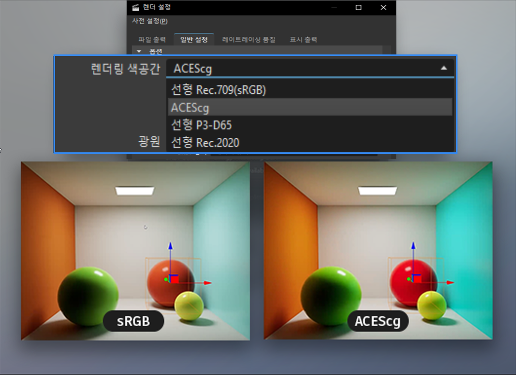 또한 AgX 사용자 지정이라는 새로운 센서 응답 드롭다운을 사용하면 강도 및 채도를 함께 제어할 때 작업이 쉬워집니다. 일반 SRGB 색공간 밖에 있는 색을 처리하는 경우 더 넓은 Gamut를 사용하면 이제 렌더 설정 내에서 다른 렌더링 색공간으로 전환할 수 있습니다. 덕분에 높은 동적 범위 출력 컨텐츠로 작업하려는 경우 등에 훨씬 더 많은 유연성을 확보할 수 있습니다.