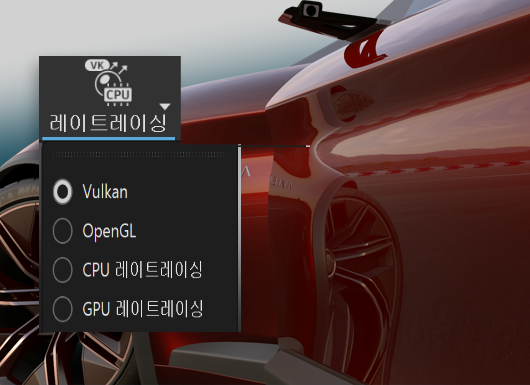VRED를 시작하면 주 도구모음의 렌더링 버튼에 새로운 Vulkan 렌더 엔진이 새로운 옵션으로 추가된 것을 볼 수 있습니다. Autodesk에서는 이 새로운 실시간 렌더 엔진을 통해 대규모 복잡한 장면을 훨씬 더 잘 처리하고 래스터화 렌더링과 레이트레이싱 측면을 혼합할 수 있는 차세대 실시간 솔루션을 사용하고 있습니다.