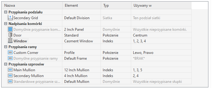 Po utworzeniu definicji elementów stylu ściany kurtynowej można je nadawać poszczególnym rodzajom składników ścian: podziałom, wypełnieniom komórek, ramom i stropom.