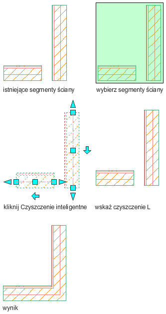 - Segmenty ścian, które się przecinają, są przycinane do uzyskania warunku wyraźnego narożnika z przecinającymi się liniami wyrównywania ścian.
