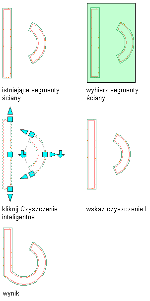 Czyszczenie kątowe działa w ten sam sposób względem segmentów ścian łukowych.