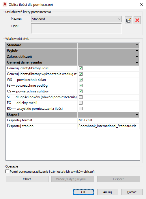 - W oknie dialogowym Oblicz ilości dla pomieszczeń wybierz następujące opcje: