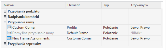 Opisana poniżej procedura pozwala dodać przypisanie ramy do ściany kurtynowej. Aby można było zróżnicować definicje przypisywane krawędziom ramy, należy skonfigurować odpowiednią liczbę przypisań ramy.
