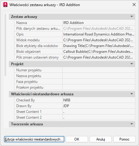 Wyświetla ścieżkę i nazwę pliku DWT lub DWG, który ma być użyty podczas tworzenia nowych arkuszy lub zestawu arkuszy.