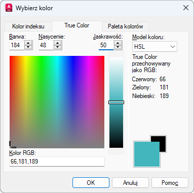 Określa zastosowanie modelu kolorów RGB do wybierania kolorów. Opcje dostępne na karcie True Color są uzależnione od tego, czy wybrany jest model HSL czy RGB.