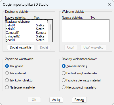 Wyświetla listę dostępnych i wybranych obiektów 3D, zapisuje obiekty 3D na warstwach i obsługuje obiekty, które używają wielu materiałów.
