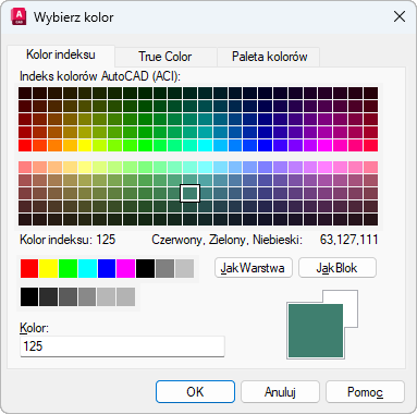 Można wybrać kolor spośród 255 kolorów z indeksu AutoCAD (ACI), kolorów True Color i kolorów palety kolorów, dostępnych na trzech kartach.