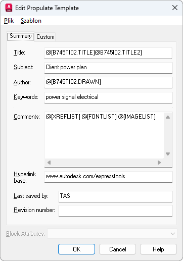 | Active template | Określ plik szablonu, który ma zostać użyty w celu aktualizacji pól Właściwości rysunku. |