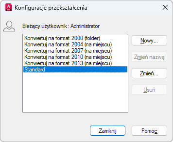 Wyświetla listę poprzednio zapisanych konfiguracji przekształcenia oraz konfigurację domyślną: Standardowa.