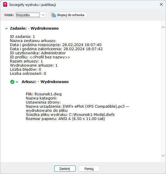 Wyświetla listę błędów, które wystąpiły podczas wykonywania zadań drukowania i publikowania.