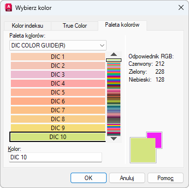 Jeżeli wybrana jest paleta kolorów, to karta Palety kolorów będzie wyświetlać nazwę wybranej palety kolorów.