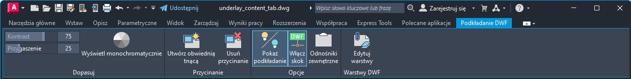 Jeśli w rysunku zostanie wybrane podkładanie DWF, na wstążce zostanie wyświetlona karta kontekstowa podkładania DWF.