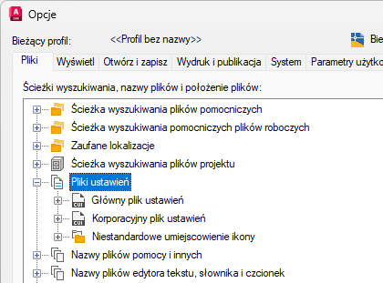 - W oknie dialogowym Opcje, na karcie Pliki kliknij znak plus (+) obok pola Pliki ustawień, aby rozwinąć listę.