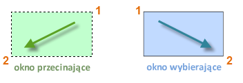 Czasem pojawia się potrzeba wybrania dużej liczby obiektów. Zamiast wybierać każdy obiekt oddzielnie, można wybrać obiekty w obszarze, klikając puste miejsce (1), przesuwając kursor w prawo lub w lewo, a następnie klikając ponownie (2).