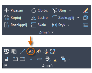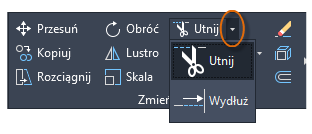 Popularnym sposobem jest użycie polecenia ODSUŃ w połączeniu z poleceniami UTNIJ i WYDŁUŻ. Przycinanie i wydłużanie to jedne z najczęściej używanych operacji. Kliknij narzędzie UTNIJ lub WYDŁUŻ lub w oknie polecenia wprowadź skrót UT w przypadku polecenia UTNIJ lub WY w przypadku polecenia WYDŁUŻ.
