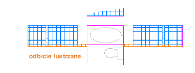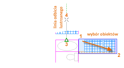 W poniższym przykładzie należy uruchomić polecenie LUSTRO (lub wprowadzić MI w oknie polecenia), użyć okna wyboru (1 i 2) w celu wybrania geometrii na prawej ścianie, nacisnąć klawisz Enter lub Spacja, a następnie określić linię odbicia lustrzanego (3 i 4) odpowiadającą linii środkowej łazienki.