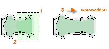 Przykładowo wpisz polecenie PRZESUŃ. Skorzystaj z metody wyboru, aby wybrać obiekty w prostokącie (1). Określ punkt bazowy (2) i kolejny punkt (3), aby określić odległość i kierunek przesunięcia. Naciśnij klawisz spacji lub klawisz Enter, aby wyświetlić wyniki.
