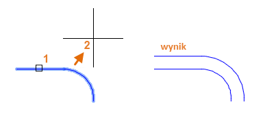 Wybierz obiekt (1), określ odległość odsunięcia i kliknij, aby wskazać, po której stronie pierwotnego obiektu ma się znaleźć wynik (2). Oto przykład odsunięcia polilinii.