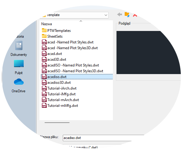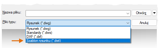 Niezależni projektanci mogą tworzyć własne pliki szablonów rysunku zgodnie ze swoimi preferencjami, a w miarę zapoznawania się z dalszymi funkcjami programu mogą dodawać ustawienia tych funkcji. Aby zmodyfikować istniejący plik szablonu rysunku, kliknij przycisk Otwórz, w oknie dialogowym Wybierz plik określ typ pliku jako Szablon rysunku (*.dwt) i wybierz plik szablonu rysunku.