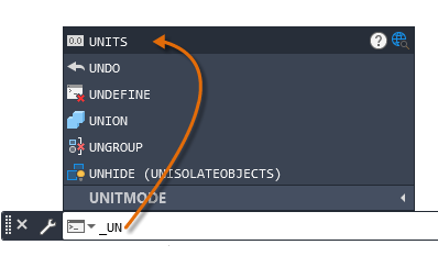 Należy zwrócić uwagę, że po rozpoczęciu wprowadzania nazwa polecenia jest automatycznie uzupełniana. Gdy, tak jak w poniższym przykładzie, dostępnych jest kilka opcji, można dokonać wyboru, klikając żądaną opcję lub przechodząc do niej klawiszami strzałek i naciskając klawisz Enter lub klawisz spacji.