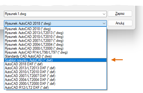 Każdy plik rysunku (.dwg) można zapisać jako plik szablonu rysunku (.dwt). Aby utworzyć nowy plik szablonu rysunku oparty na istniejącym, otwórz istniejący plik szablonu rysunku, zmodyfikuj go, a następnie zapisz pod inną nazwą.