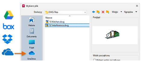 W przypadku posiadania konta u dostawcy usługi przechowywania w chmurze można je dodać do paska Miejsca w oknach dialogowych wyboru plików programu AutoCAD w celu bezpośredniego przejścia do rysunków na koncie przechowywania w chmurze. Wystarczy kliknąć prawym przyciskiem myszy pasek Miejsca i wprowadzić nazwę i ścieżkę do skrótu dotyczącego nawigacji.