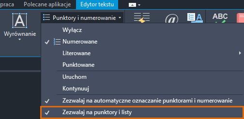 Na karcie kontekstowej wstążki Edytor tekstu, na panelu Akapit, kliknij opcję Punktory i numerowanie. Wybierz opcję Numerowane.