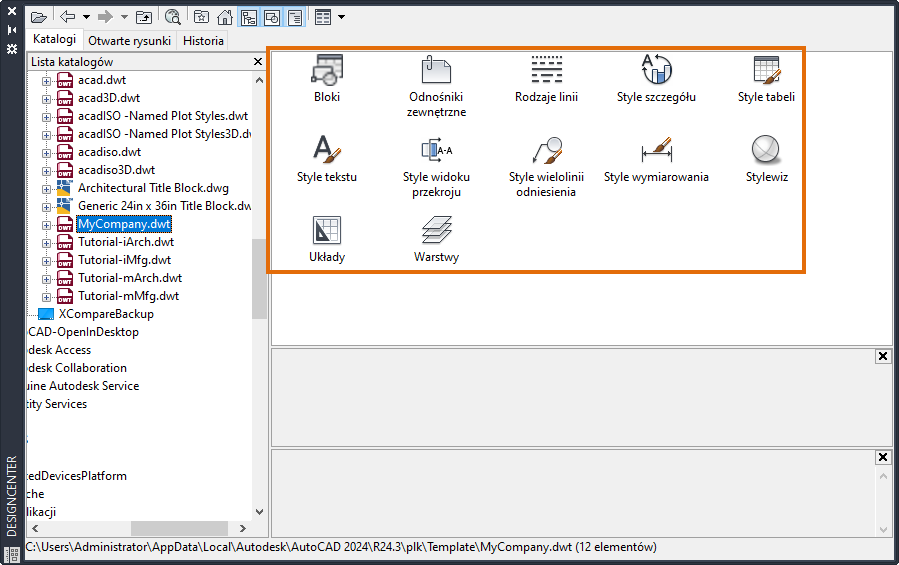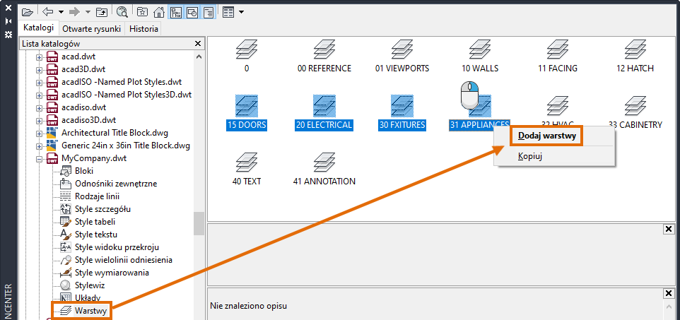 Wszystkie style i warstwy istniejące w szablonie są od teraz dostępne w bieżącym rysunku. Istniejące style i warstwy o tych samych nazwach nie zostaną zmodyfikowane.