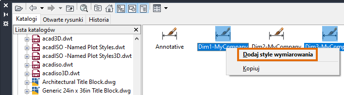 Zostaną wyświetlone style wymiarowania zdefiniowane w rysunku lub szablonie.