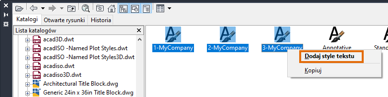 Zaznacz style, które chcesz zaimportować, kliknij prawym przyciskiem myszy i wybierz polecenie Dodaj style tekstu.